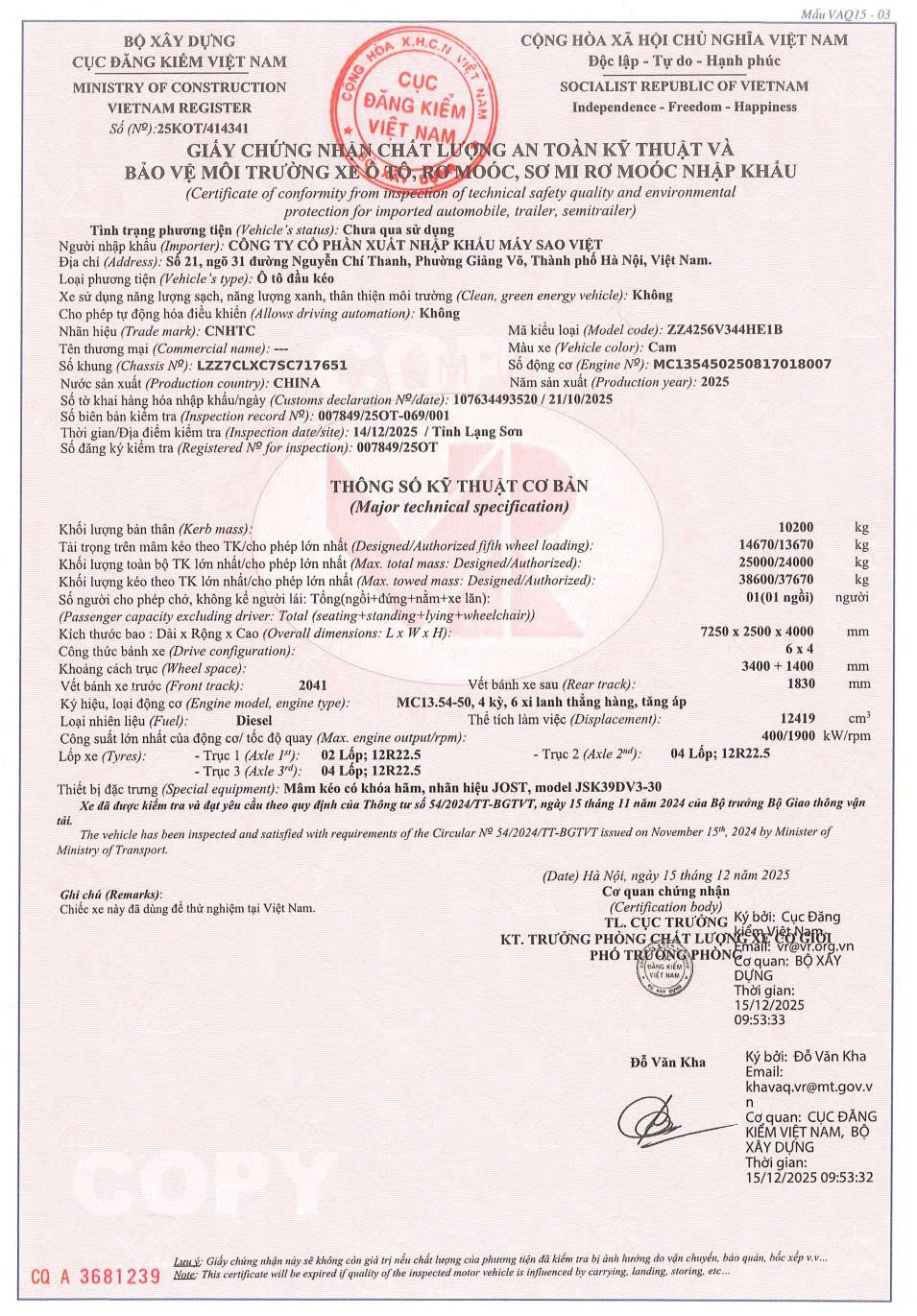Thông Số Kỹ Thuật Xe Đầu Kéo Sitrak G7